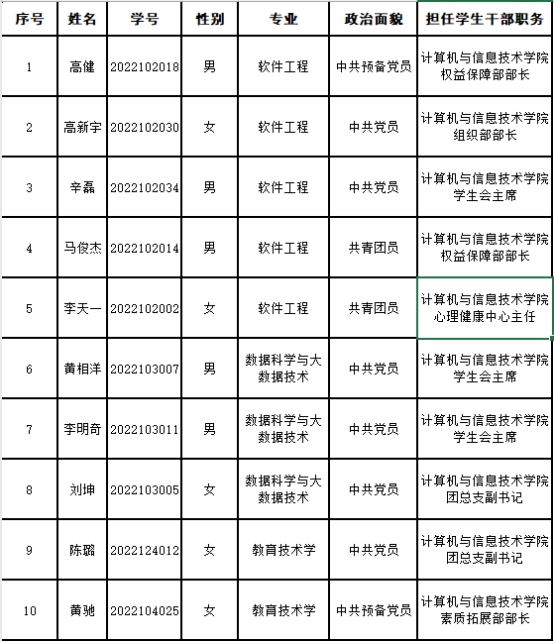 根据学校组织部要求,计算机与信息技术学院党委决定推荐共10人:高健、高新宇、辛磊、马俊杰、李天一、黄相洋、李明奇、刘坤、陈璐、黄驰;公示期为2026年1月28日--2026年1月30日。如对上述人员有异议,可以在公示期间反映,反映情况必须实事求是。本次推荐人员名单不是最终名单,以是否通过省里审核为准,如省里审核未通过还需要按照排名顺延。