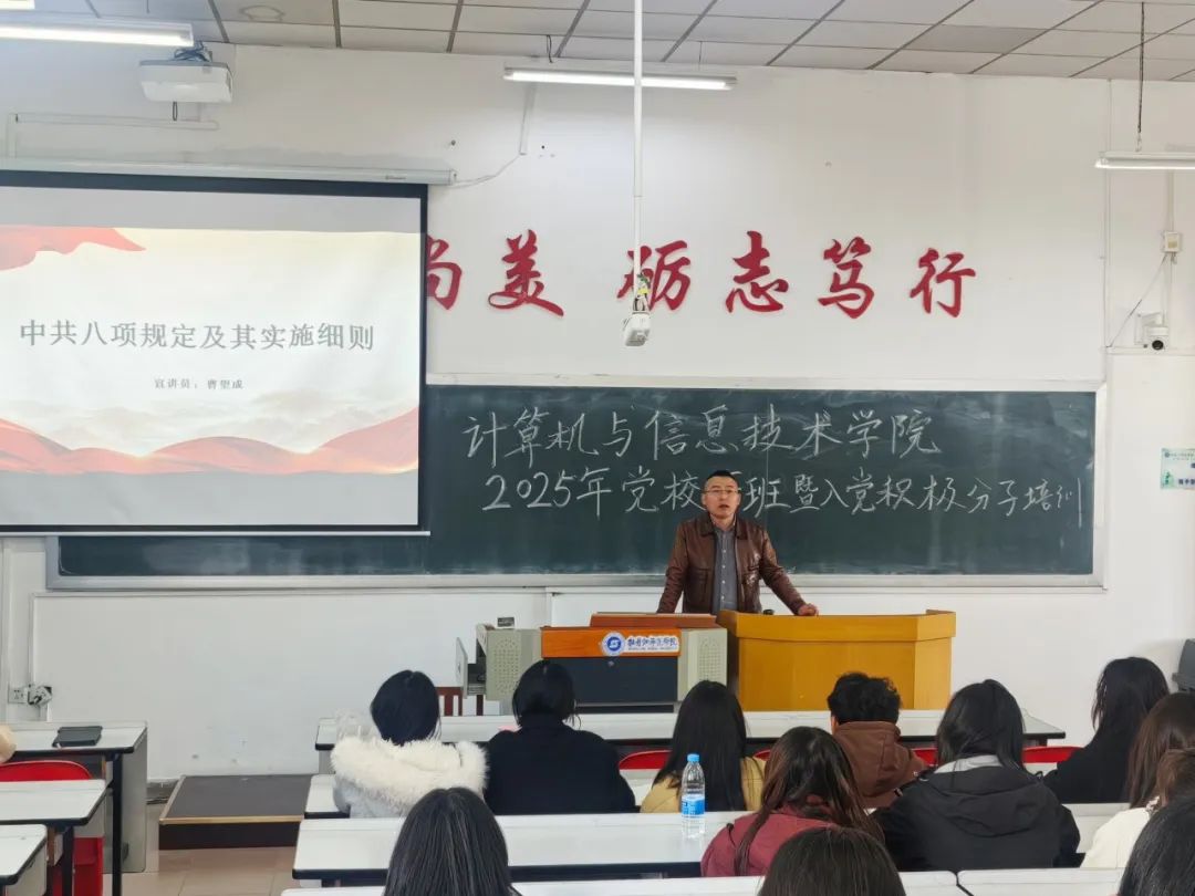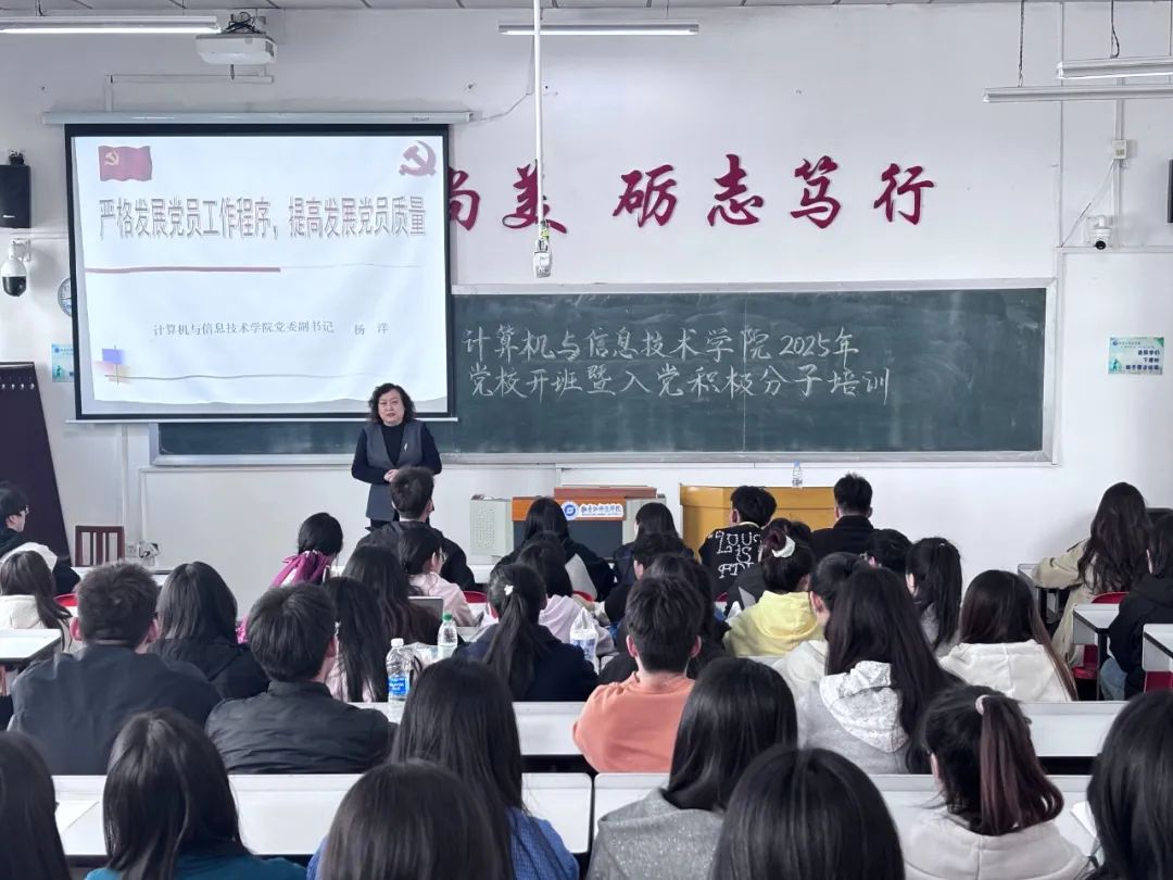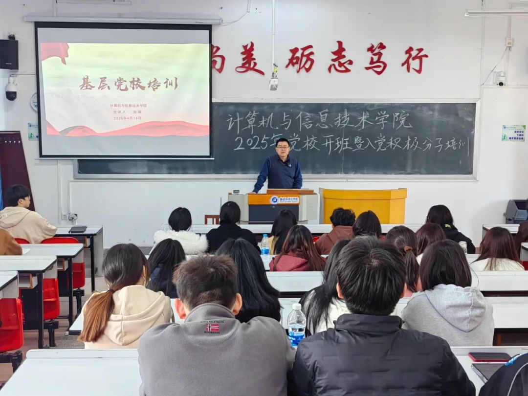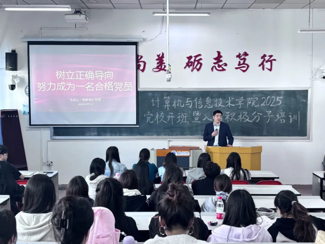 为提高入党积极分子的理论素养和思想认识水平,扎实推进新时代党员队伍建设,计算机与信息技术学院举办了2025年上半年入党积极分子培训班。学院党委书记陈君、院长孙强、党委副书记杨洋、副院长曹望成分别在4月10日、4月11日以及4月16日为学生讲授党课,重点积极分子培养对象参加培训。