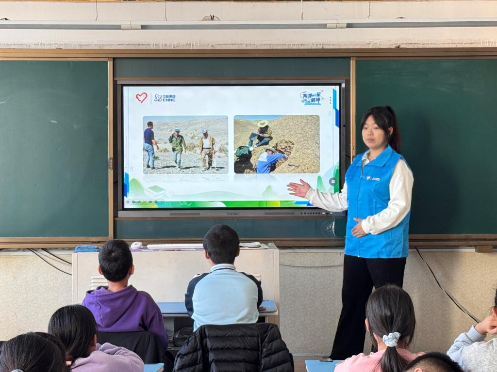 活动开始,志愿者播放北山科研团队纪实短片。镜头中“喝 88 元/立方米的水、住彩钢房、在山顶找信号”的艰苦场景,瞬间吸引了学生们的注意力,让他们直观了解到科研人员扎根戈壁的奉献日常。随后,志愿者以“守护地球的‘万年保险箱’”为核心,结合三代科研人的奋斗故事,生动讲解高放废物的危害与深地质处置原理,着重介绍北山工程的地质选址区、地下实验室、多重防护系统等核心模块,帮助学生建立对 “核” 的科学认知,打破片面恐惧。
