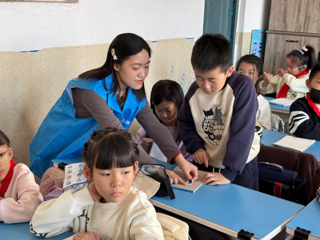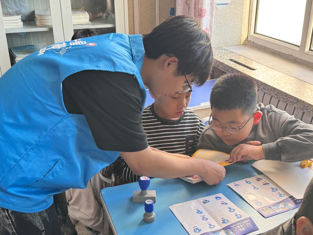 在实践互动环节,宣讲团成员们身着蓝色志愿服为同学们加盖特色印章并向同学们讲解印章背后的鼓励意义。此次活动旨在通过趣味形式激励同学们积极向上,用细致服务传递温暖,引导学生树立“科技守护全球安全”的价值观念。