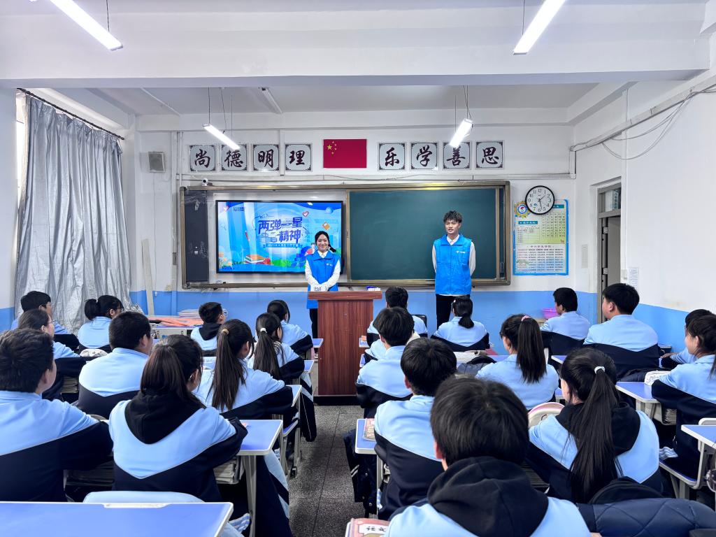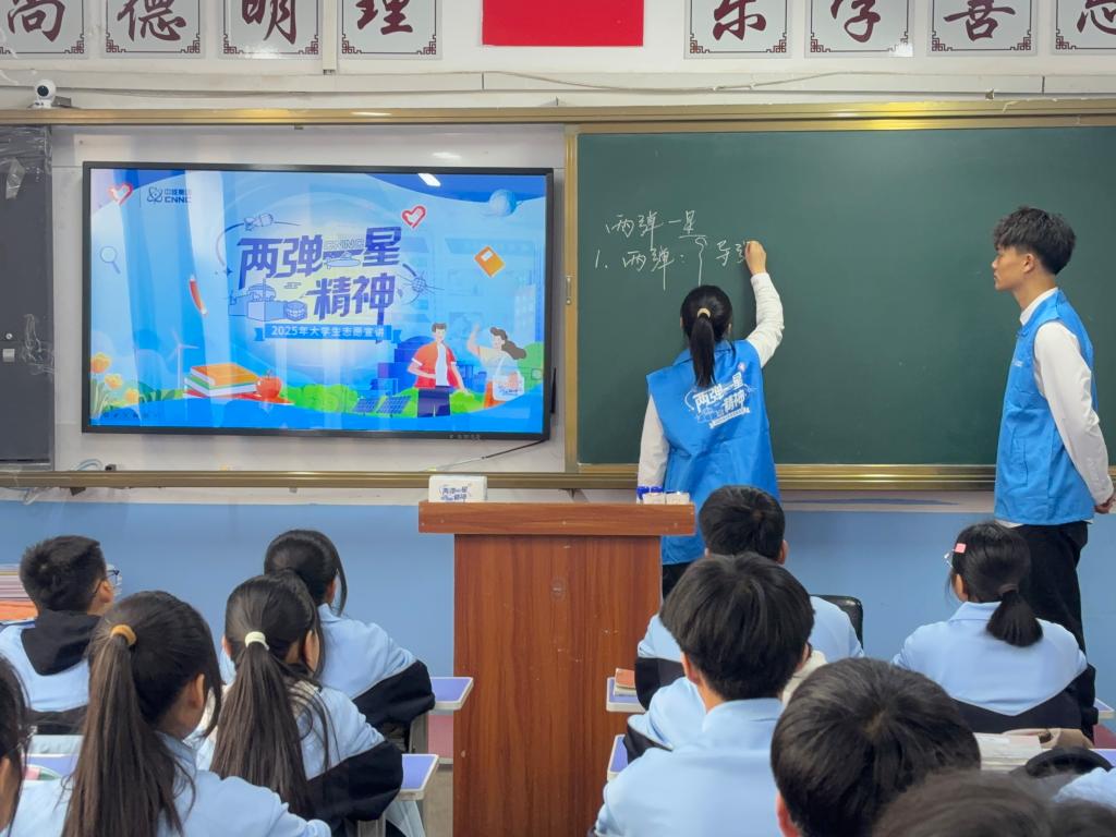 志愿者们精心筹备,依托课件演示与板书讲解这两种有效形式,全方位且深入细致地梳理“两弹一星”(原子弹、氢弹、导弹、人造卫星)的发展历程,从早期艰苦的科研环境到关键技术的一次次突破,都进行了详尽的呈现;同时深入剖析其背后的技术突破要点,以及其中所蕴含的伟大精神内涵,让学生们能清晰了解这一伟大事业的来龙去脉。