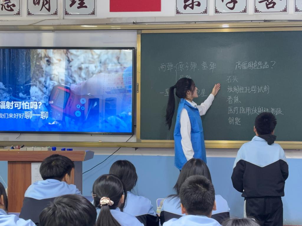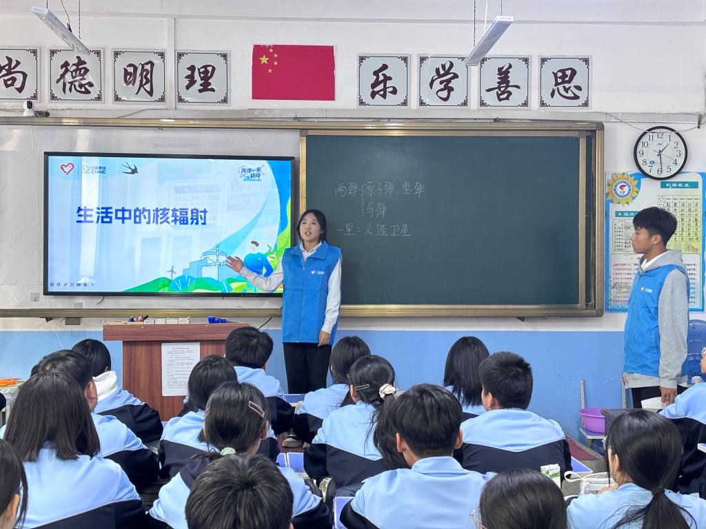 为进一步深化青少年对环保与科学的认知,助力“双碳”理念的广泛普及,10月29日,计算机与信息技术学院党委副书记杨洋率领暖阳·e行“两弹一星”宣讲团前往宁安市第三中学,开展了以“核力碳达峰·助力碳中和——生活中的核辐射”为主题的志愿服务活动。在本次活动中,学生志愿者们化身为“科普讲师”参与其中。