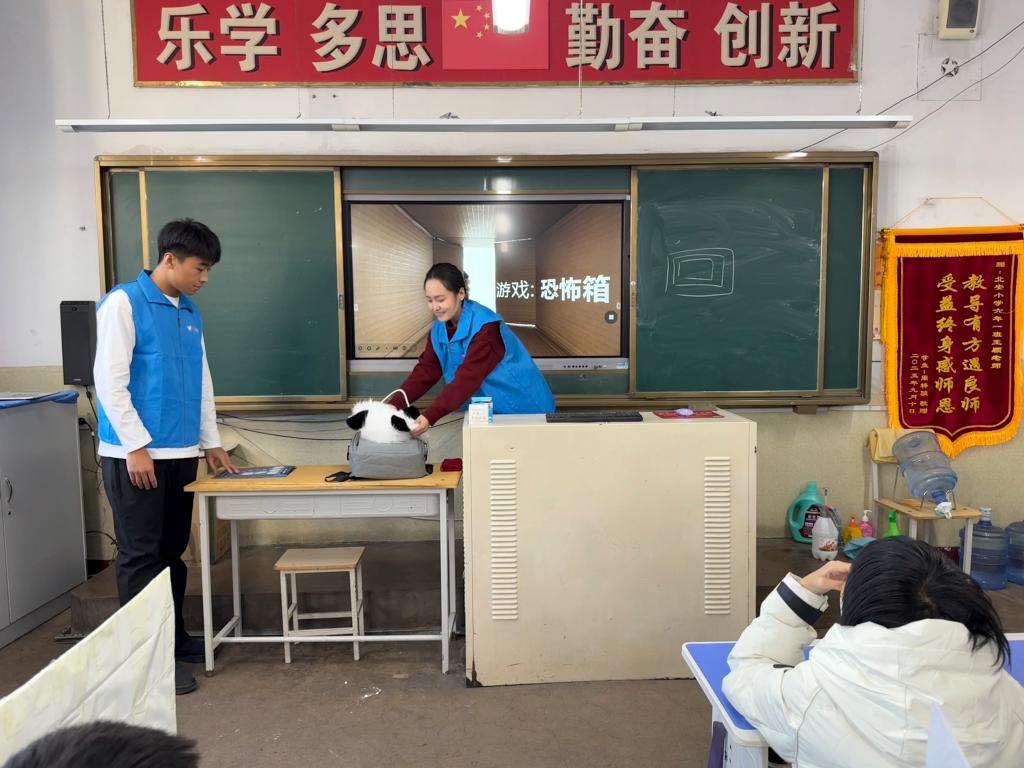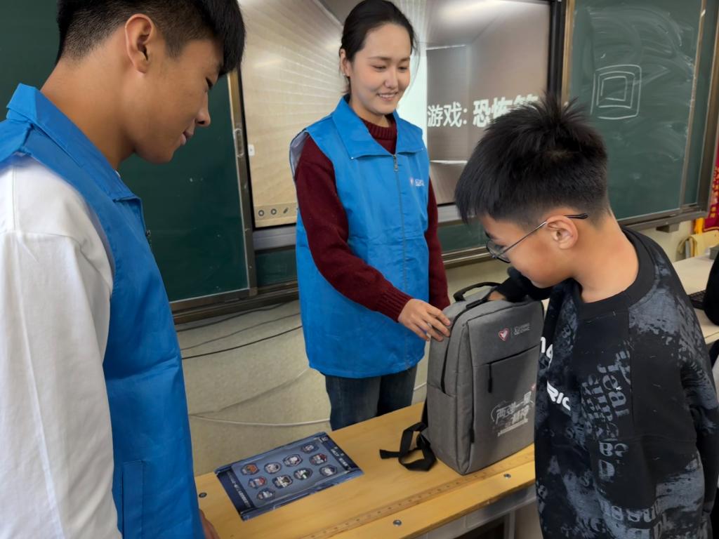 随后,最让人期待的“神秘恐怖箱”互动环节登场啦!宣讲员将神秘背包作为互动道具,邀请同学们伸手触摸箱内物件,同时引导大家思考“这物件是否带有辐射”“对应的辐射是否安全”两个问题,这场“盲盒”式的趣味互动,既营造出新奇专注的活动氛围,也让辐射安全知识自然融入体验过程。