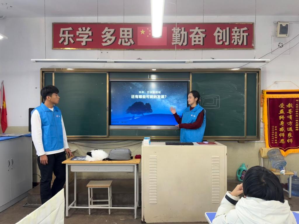 活动尾声,宣讲团成员给小学生们贴上主题贴纸。默契互动里,科普的种子悄然扎根,灿烂的笑容洋溢在每个人脸上,共同奏响了一曲融合着求知渴望与青春活力的和谐乐章。