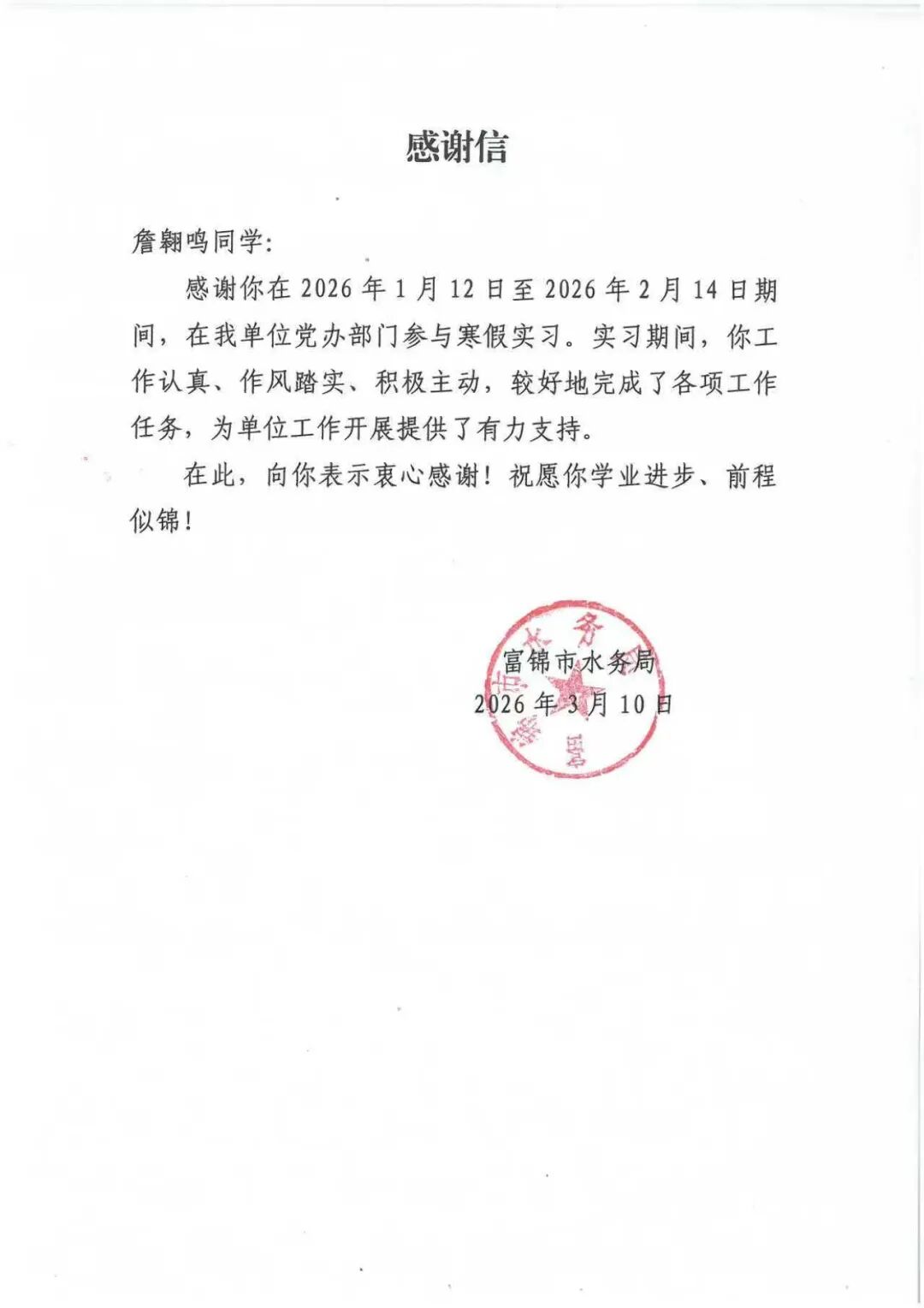 此次实践让我走出课堂、扎根家乡,在一线岗位上锻炼了数据处理能力与责任意识。我不仅学习了水资源管理、河道管护、水利工程运维等专业知识,更感受到基层工作者严谨务实、服务群众的工作作风。未来我会继续以专业所长服务地方发展,把实践收获转化为学习动力,努力成长为能为家乡建设贡献力量的新时代大学生。